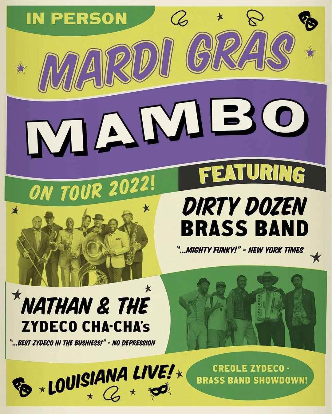 We are excited to announce the rescheduling of our Mardi Gras Mambo Tour with Nathan & the Zydeco Cha Chas which will now begin one year later in February 2022! Check out our Tour page for dates, tickets, and more info to come see us in a city near you.